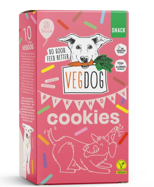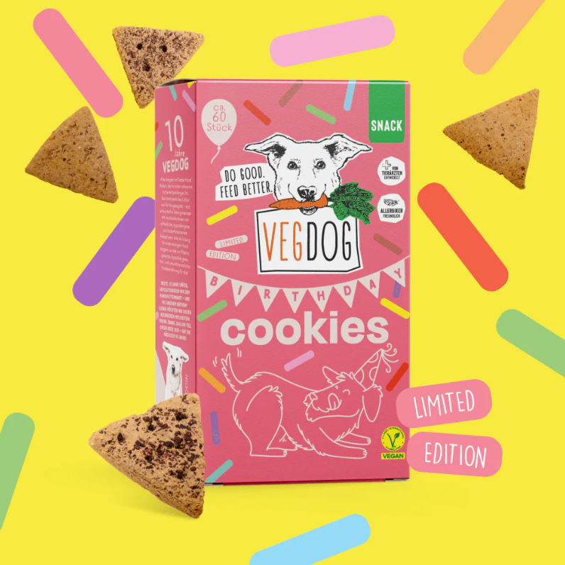 In honor of VEGDOG’s 10th anniversary, we’ve crafted this Limited Edition: delicious cookies that make every day feel like a little celebration. Whether it’s for a birthday, a dog party, or just because – our Birthday Cookies turn every moment into a cheerful treat. Of course, they’re 100% vegan and lovingly baked.