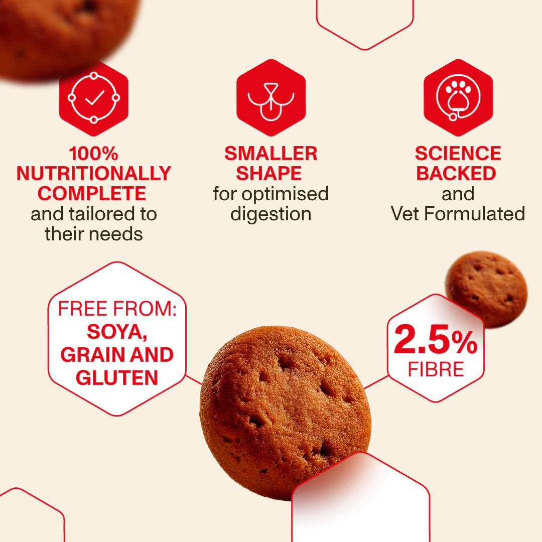 Finally, food that your sensitive dog will actually enjoy. Bring calm back to mealtimes — no more stomach issues, itchy skin, or struggles with picky eaters. Packed with natural flavors like sweet potato, apple, and carrot. The formula is hypoallergenic, grain-free, soy-free, and gluten-free, low in fiber, and formed into small kibble for easier chewing — ideal for smaller breeds or sensitive dogs that need a gentler meal. Developed by our veterinary experts, this delivers complete, balanced nutrition without compromising on taste.